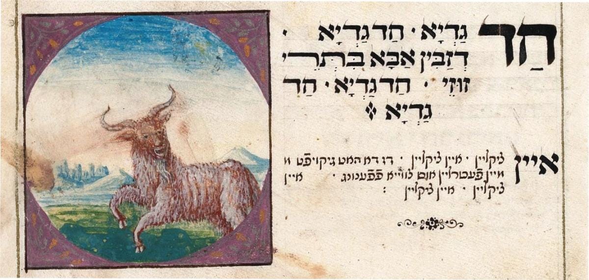 This image is a traditional illustrated Haggadah page of Chad Gadya—the opening stanza with the goat (“חד גדיא”), with Yiddish transliteration, a visual form that has appeared in many manuscripts and printed editions over centuries.
