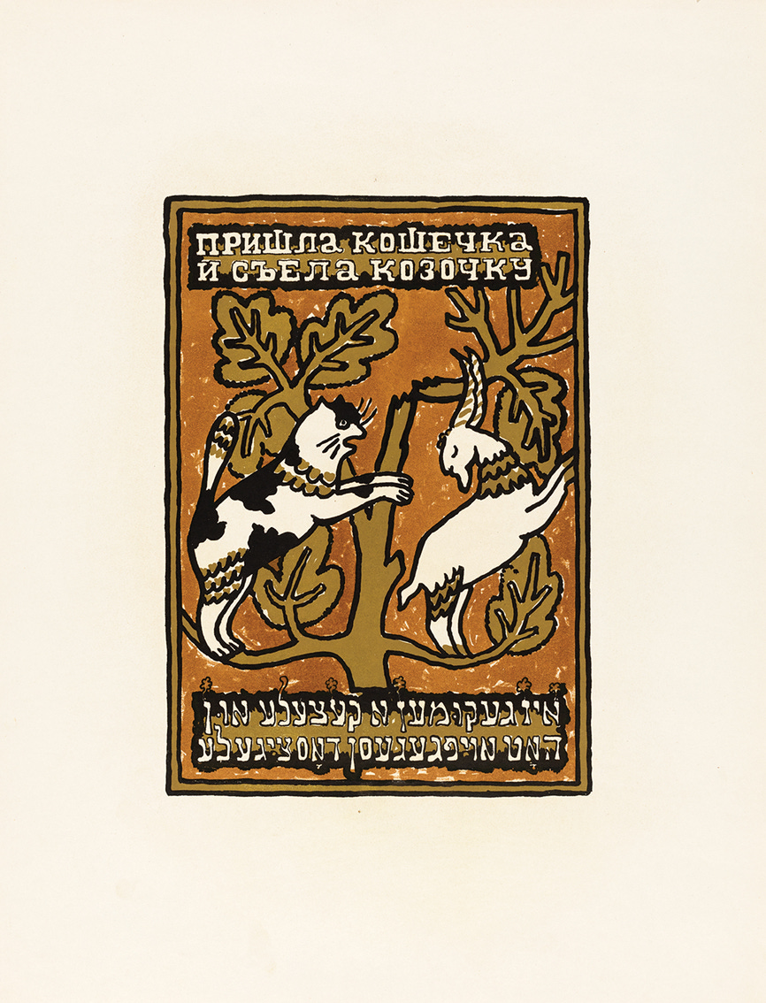 A traditional Eastern European Chad Gadya illustration, most likely from a late 19th–early 20th century printed Haggadah. The text at the top is in Russian/Cyrillic (“the cat came and ate the goat”), and the bottom line is in Yiddish (Hebrew script).