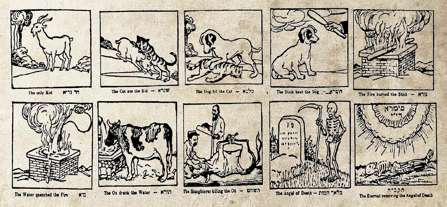 It is sung at the very end of the Passover Seder, built as a chain: one act answered by the next - cat, dog, stick, fire, water - until the sequence ends with god.