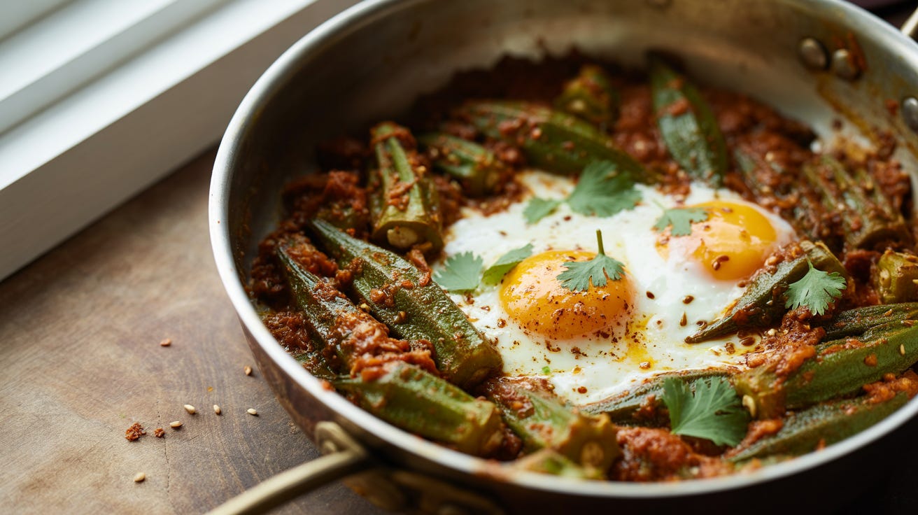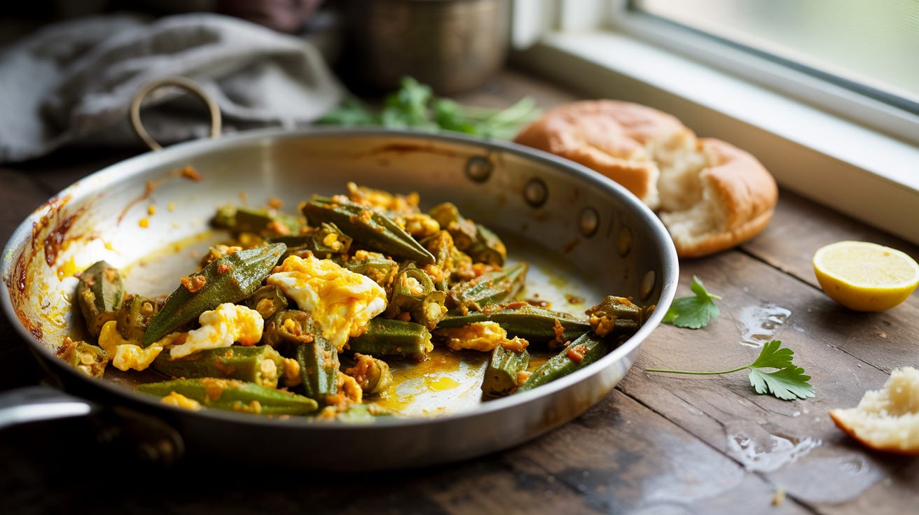In some kitchens, the eggs are stirred into the okra - soft, integrated, closer to a scramble.