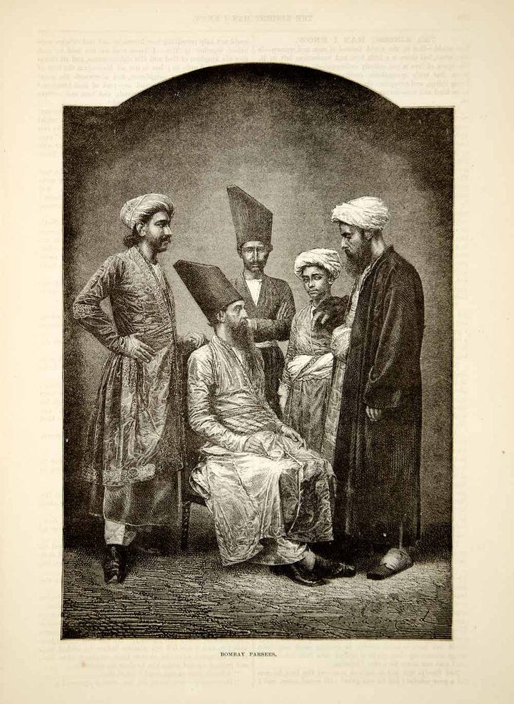 “Bombay Parsees” An original 1876 black and white in-text wood engraving of Parsi (or Parsee) men, part of the Zoroastrian community in Bombay, India. (Periodpaper.com)