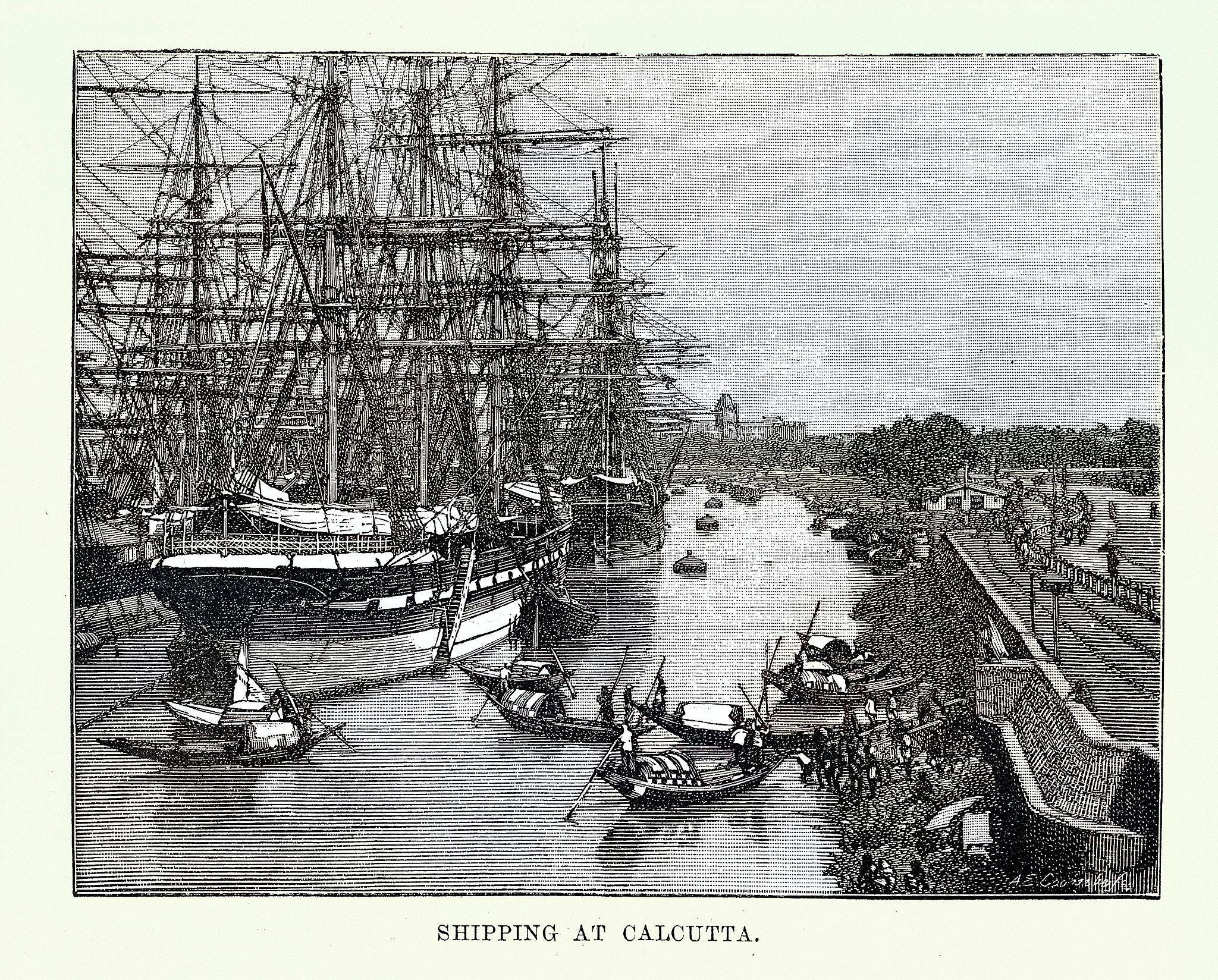 Sailing ships in the port at Calcutta, India, Victorian, Vintage illustration, 19th Century 1880s