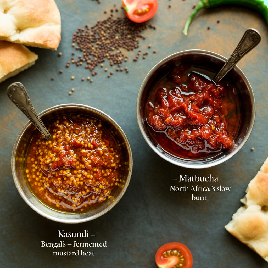 Both are condiments born from necessity. No fridge? No problem. Preserve your bounty with acid (Kasundi) or oil and time (Matbucha).