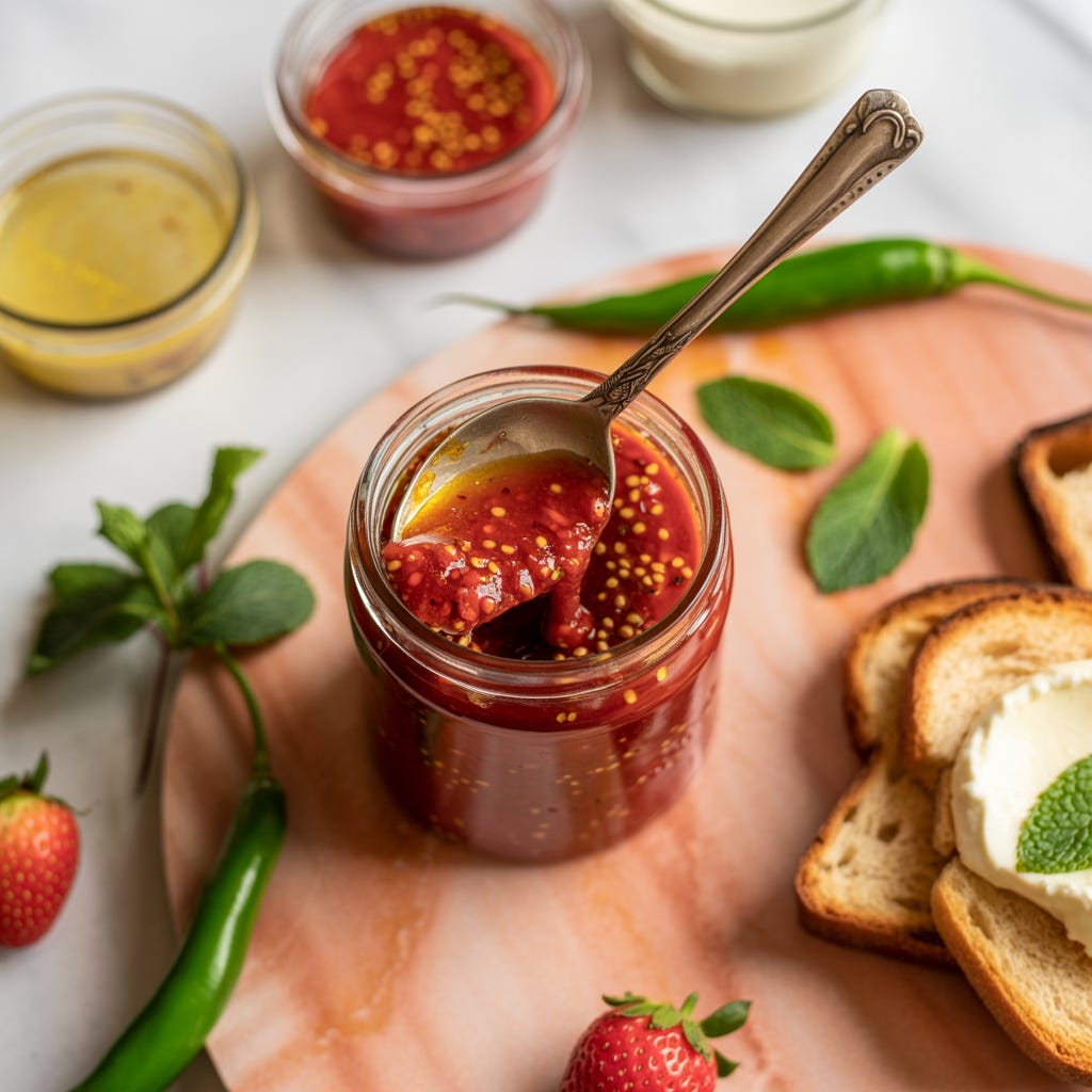 A Strawberry Kasundi — inspired by once colleague and always friend Susan Freiman and her modern takes on chutneys — slides into the Matbucha camp without meaning to. It’s cooked down. Sweet. Glossy. Still spiced, but the edge is rounded. A hybrid of technique, not tradition.