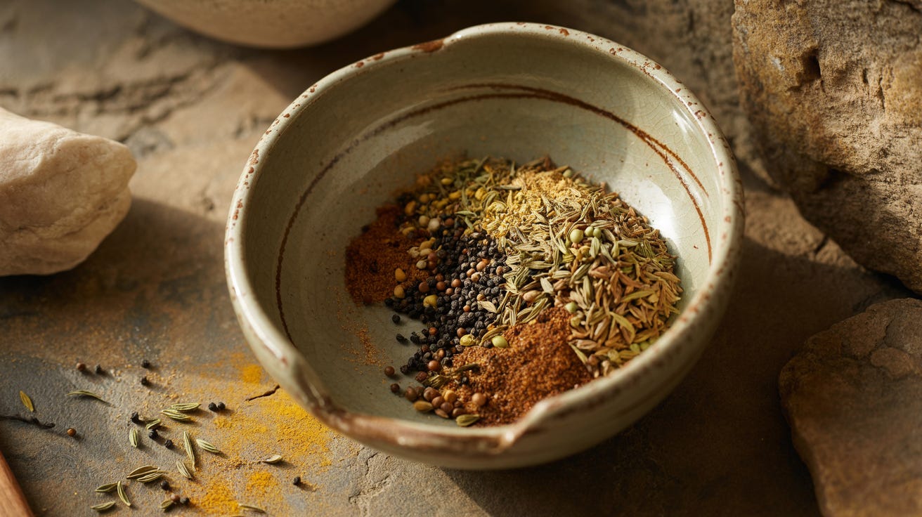 The spices should hum in the background - fennel sweet, nigella slightly bitter, mustard sharp.