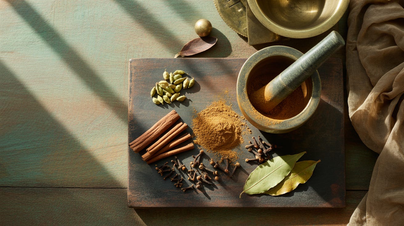In the kitchens I grew up with, whole spices entered hot oil at the beginning - cardamom, clove, cassia - releasing themselves gradually. Powdered spices came later, coaxed carefully, buffered by onion, ginger, tomato, water.