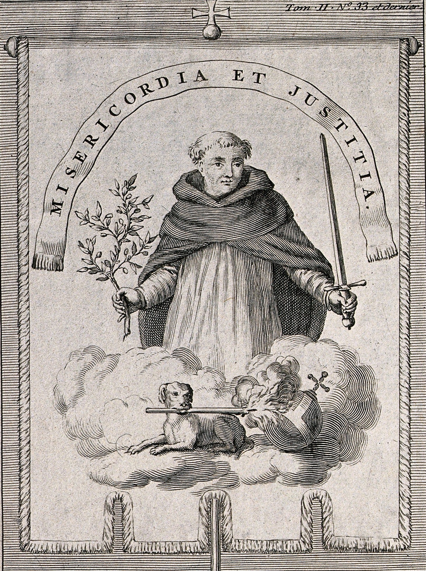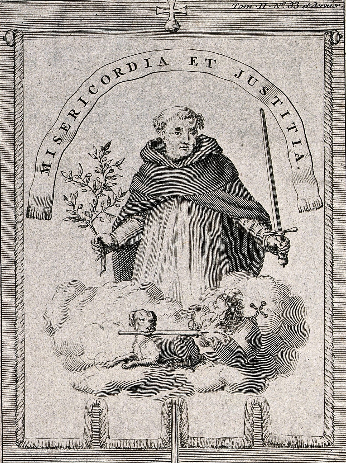An allegorical emblem of the Inquisition: a friar bearing the symbols of compassion and judgment, while below, the instruments of punishment are already at work. (Anonymous engraving, “Misericordia et Justitia” (18th century), associated with early modern European critiques of the Inquisition, including editions of Histoire de l’Inquisition).
